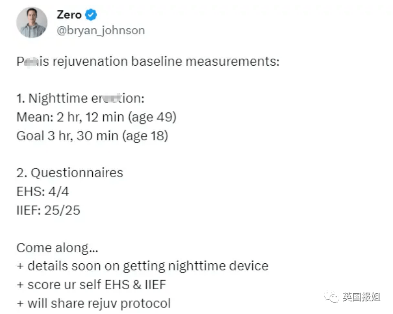 上周四,他在社交平台上发帖分享,“开始了第一次回春治疗,聚焦式冲击波治疗6次,每周3次,费用为1000到2000美元。”
