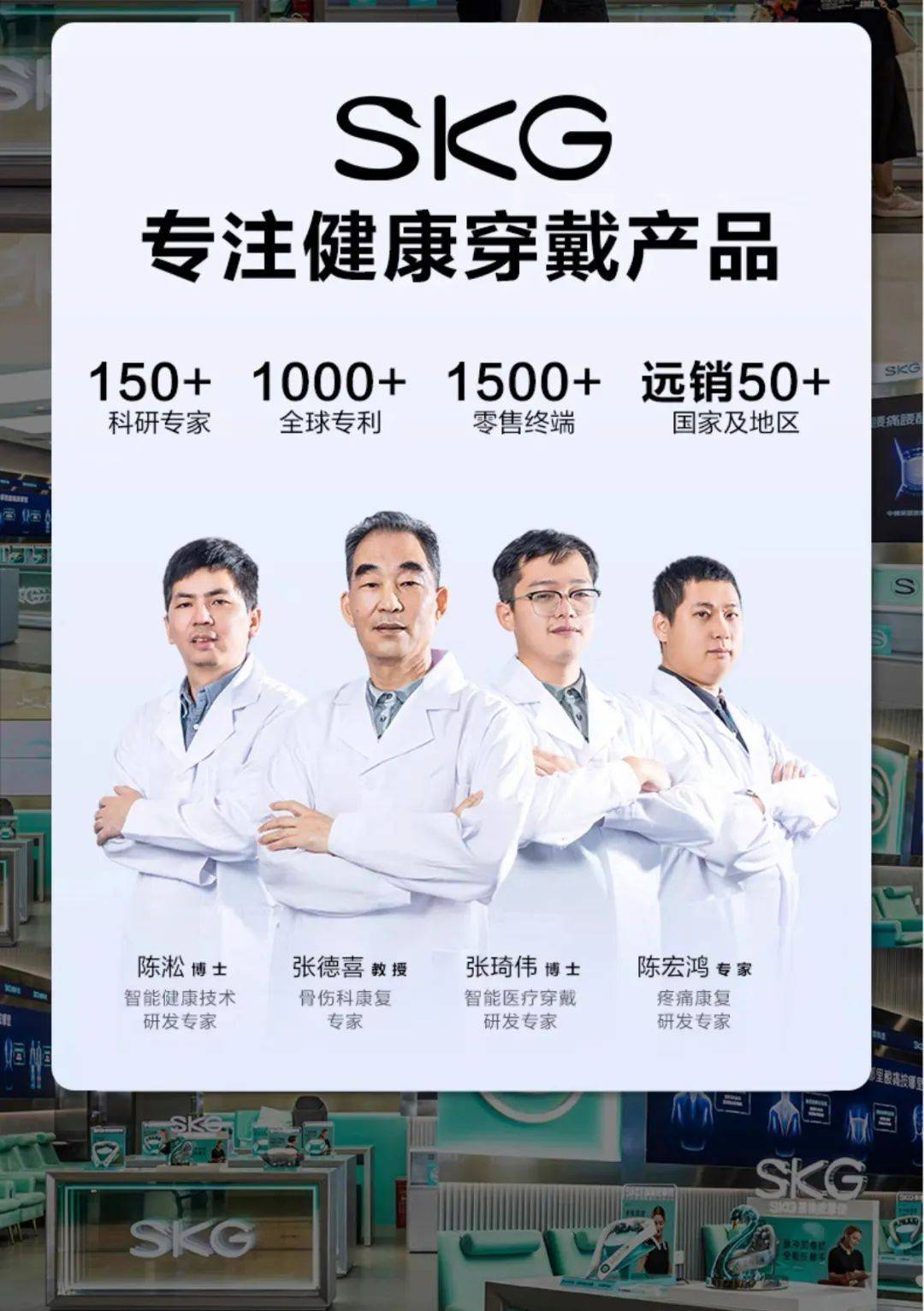 在SKG的淘宝官方旗舰店中,一款产品的宣传页面里,出现“专业拨筋按摩手法”“像按摩师揉捏般享受”的宣传语,并以其拥有“150+”的科研专家为噱头。除此之外,还特别列出四位骨伤科康复专家、疼痛康复研发专家为其做背书。