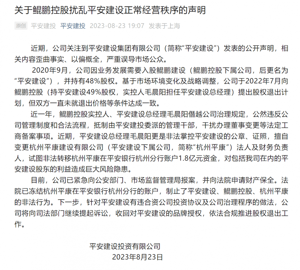 近期,平安建设总经理毛某阳更是非法掌控平安建设的公章、证照,擅自变更杭州平康建设有限公司(平安建设下属公司,简称“杭州平康”)法人及财务负责人,试图非法转移杭州平康在平安银行杭州分行账户1.8亿元资金,对包括我司在内的平安建设股东的利益造成巨大风险隐患。”平安建投表示。