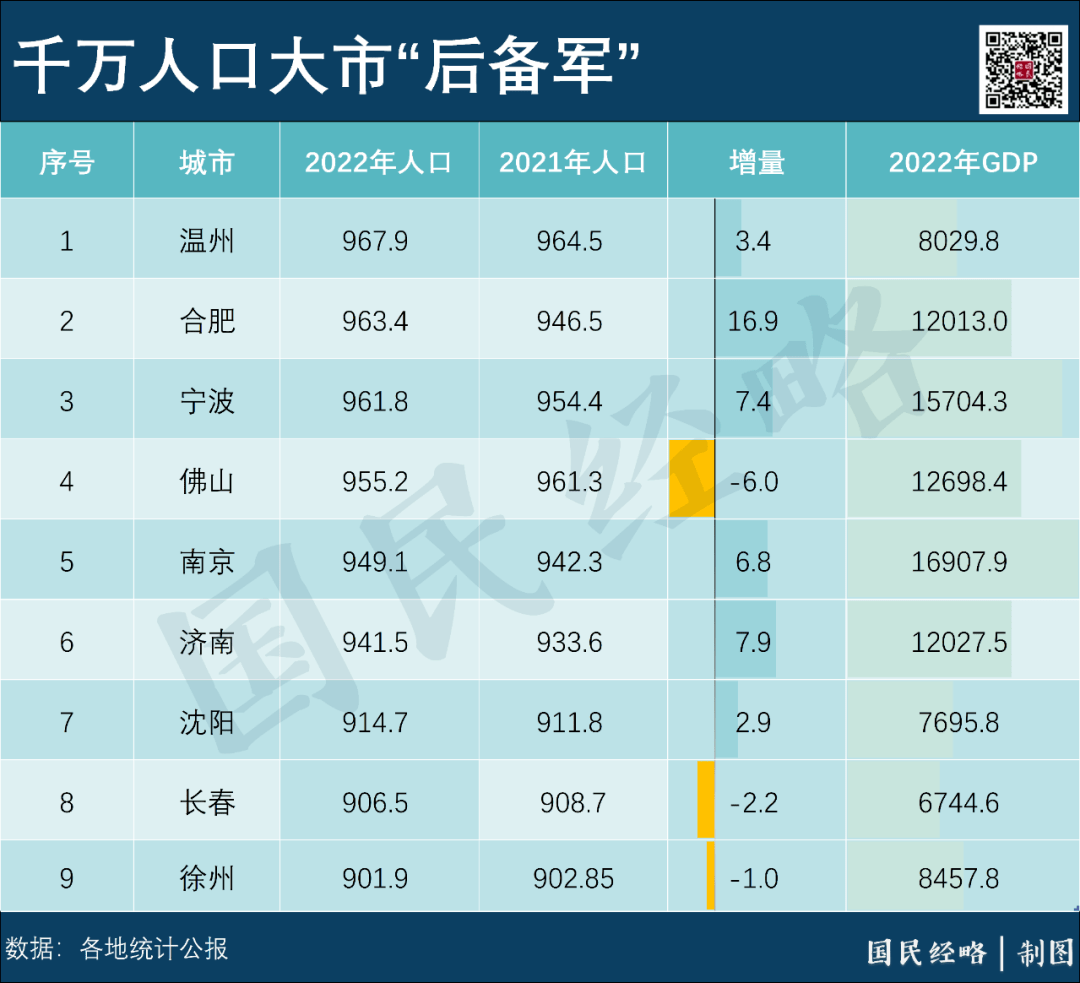 根据统计公报,2022年合肥常住人口为963.4万人,净增加16.9万人,增量位列全国第三,总人口离千万大关只有一步之遥。