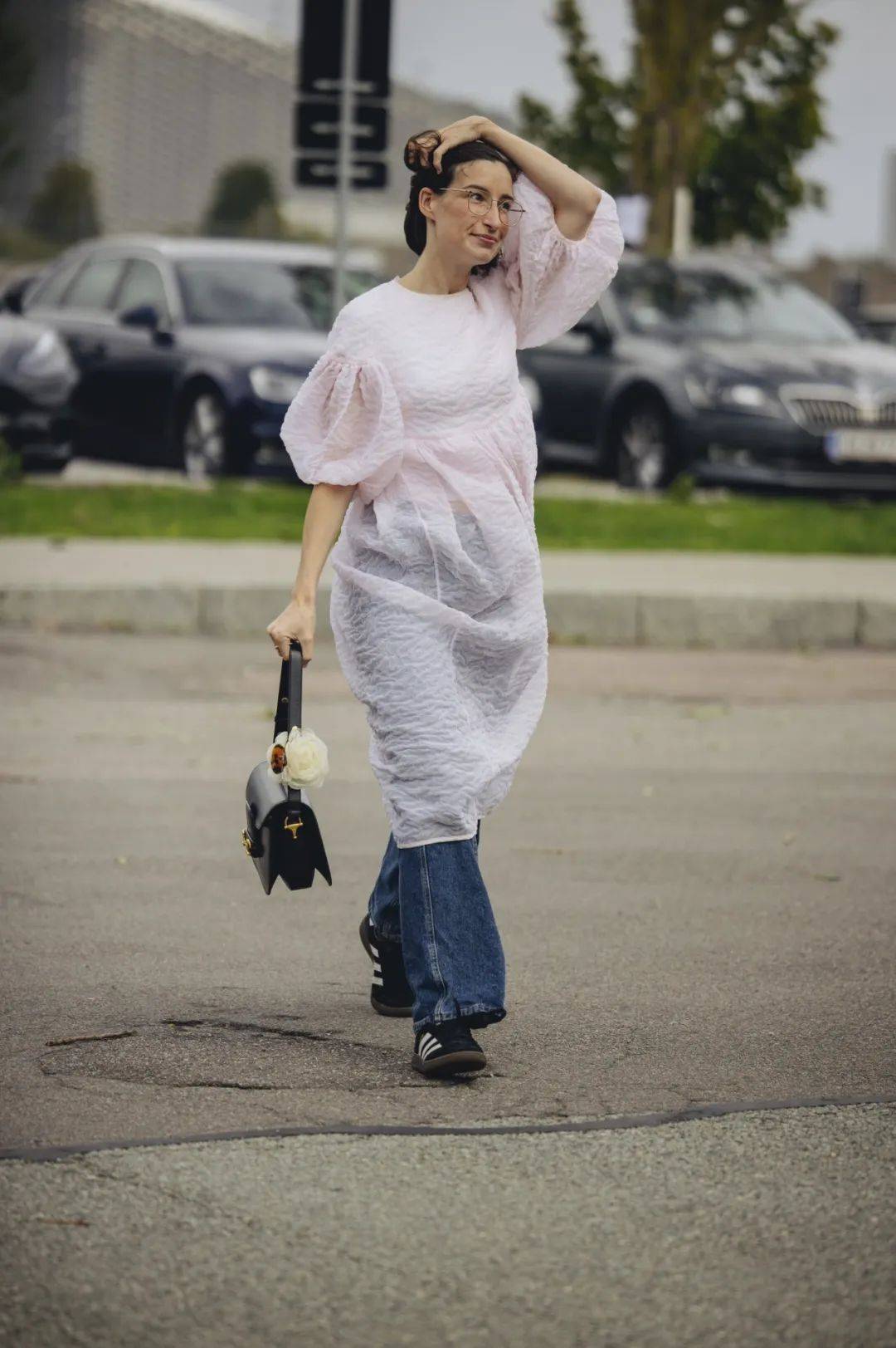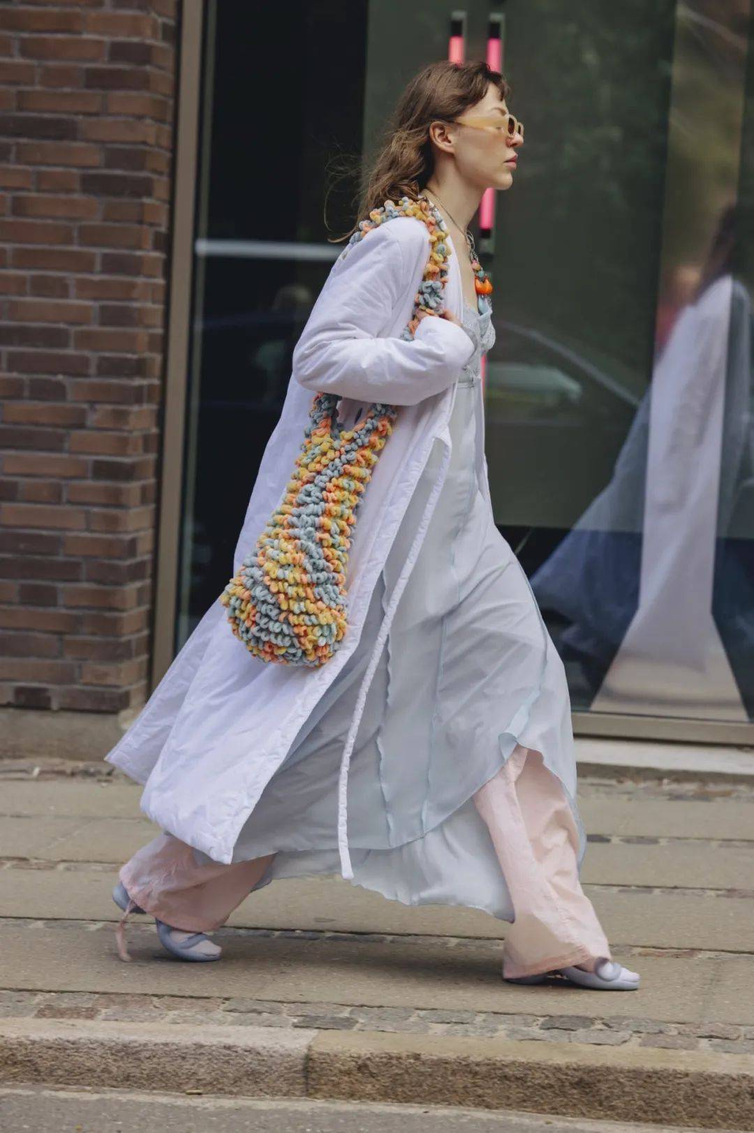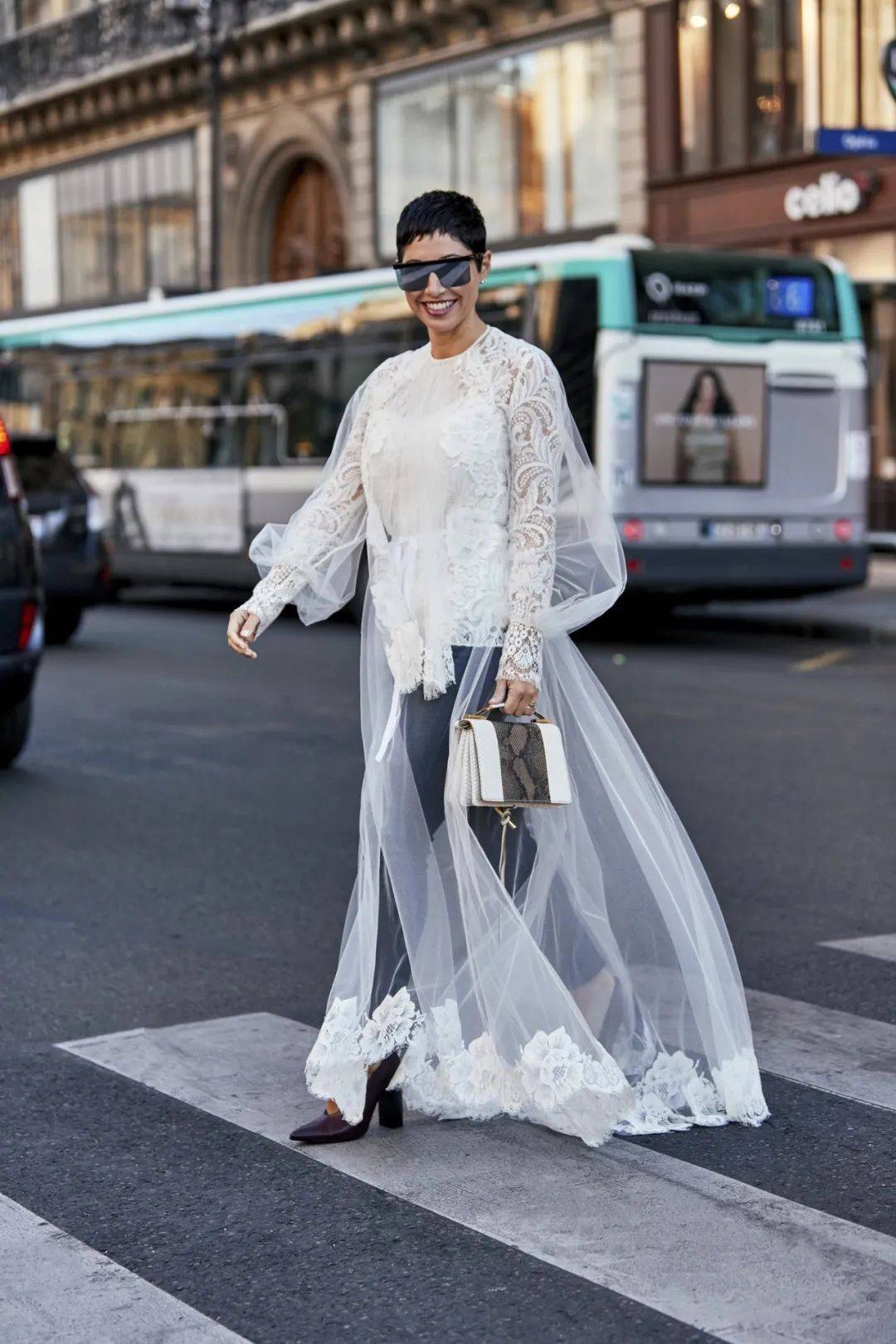 这种叠穿要想拥有轻盈感,那么裙子的质地就要尽量以轻薄为主,类似雪纺和薄纱材质,风吹起时摇曳的裙摆可以化解叠穿造成的体积感,算是通过“四两拨千斤”的巧思来打破厚重和沉闷的可能性。