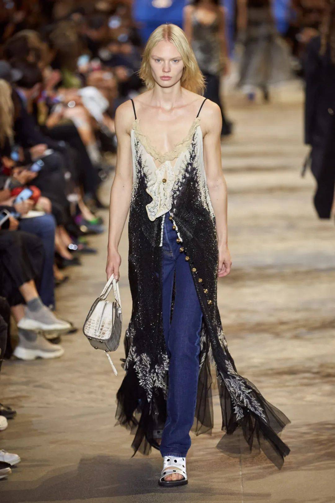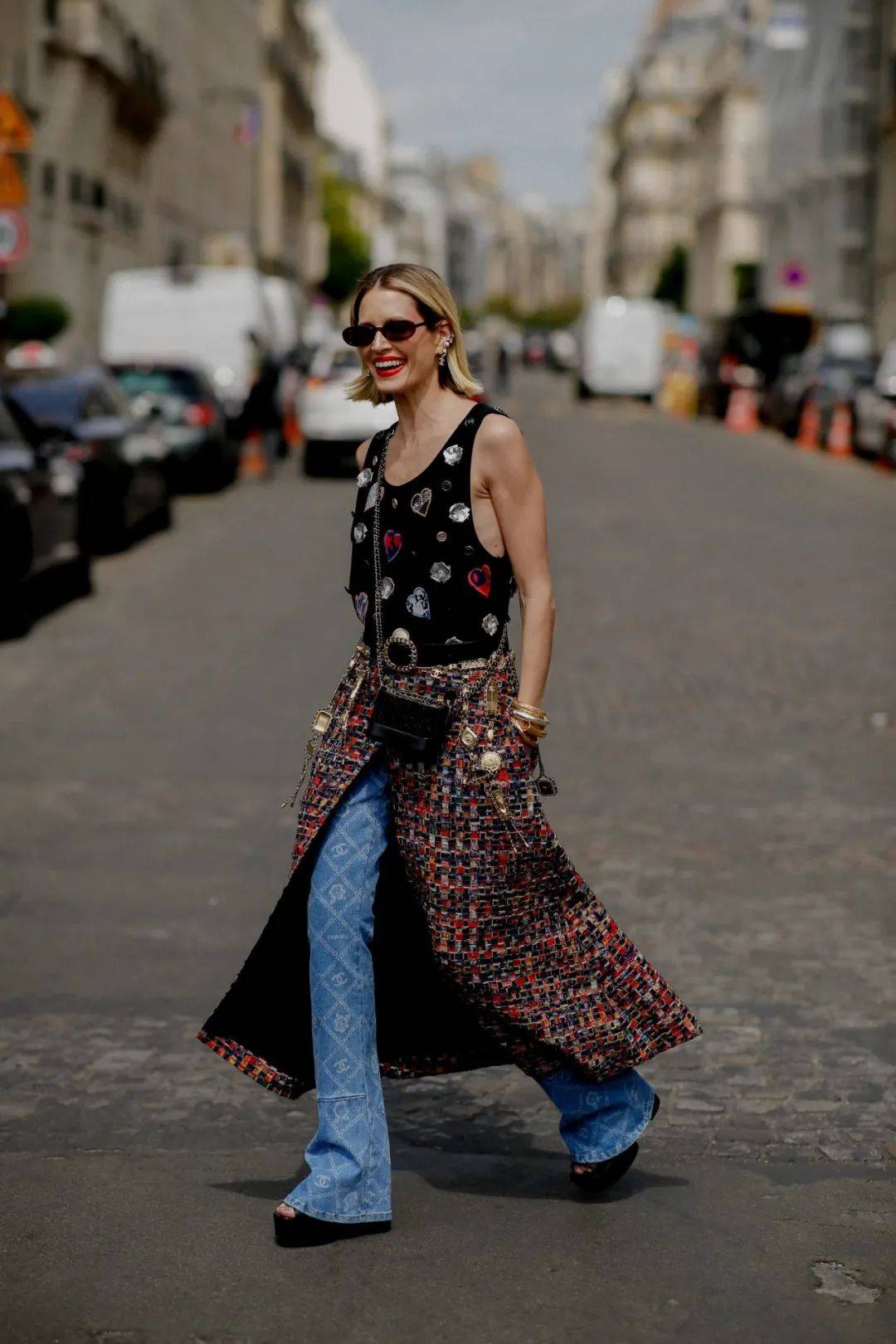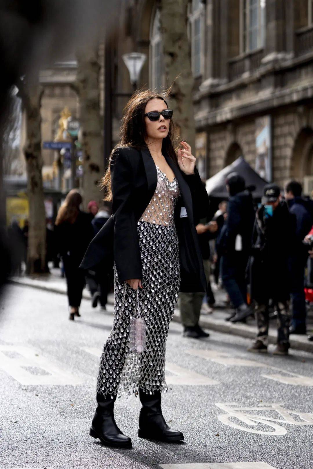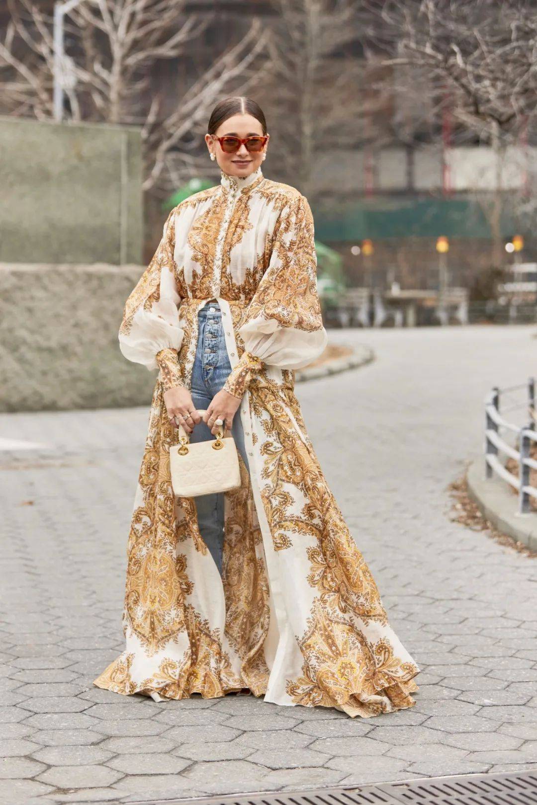 这种叠穿要想拥有轻盈感,那么裙子的质地就要尽量以轻薄为主,类似雪纺和薄纱材质,风吹起时摇曳的裙摆可以化解叠穿造成的体积感,算是通过“四两拨千斤”的巧思来打破厚重和沉闷的可能性。