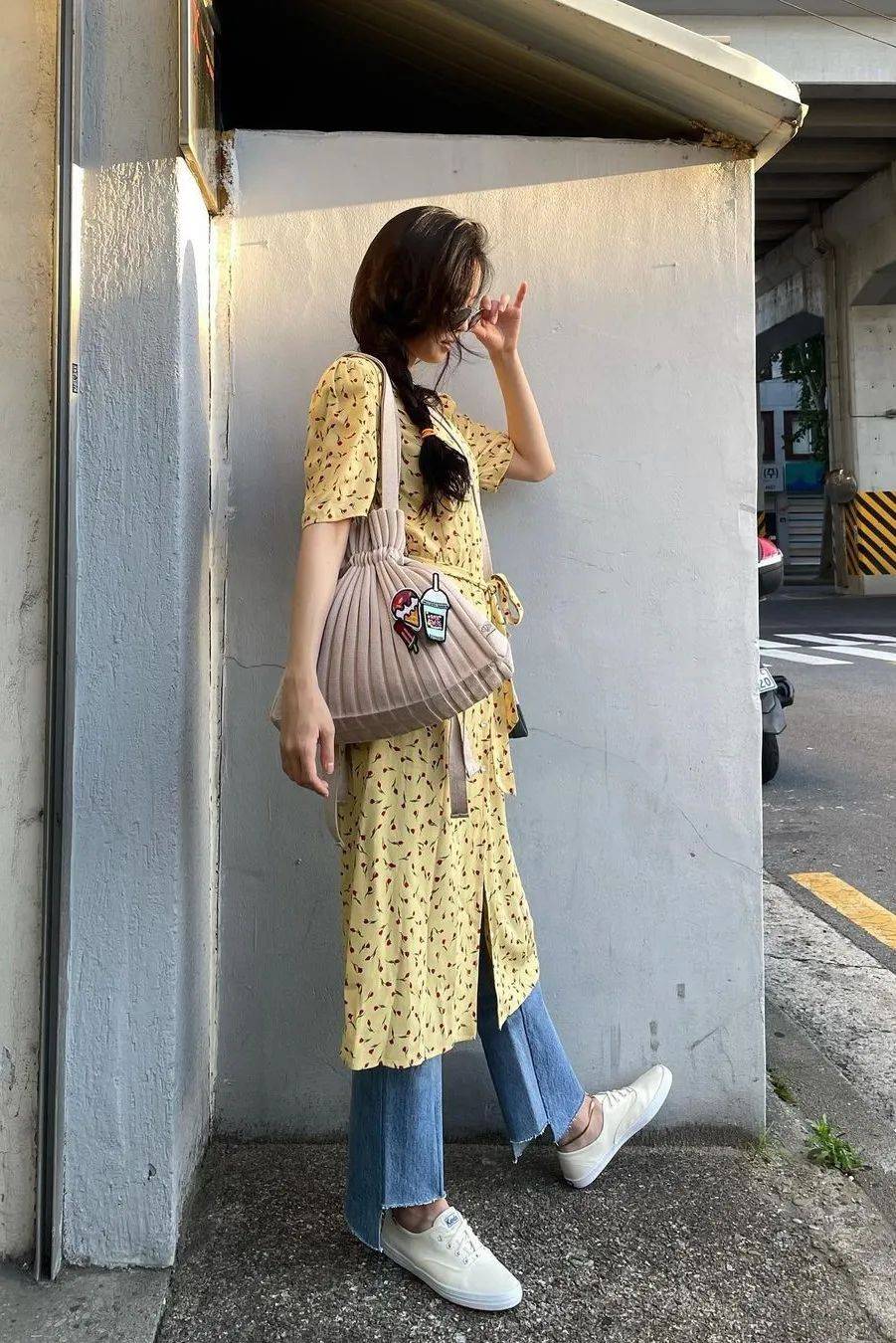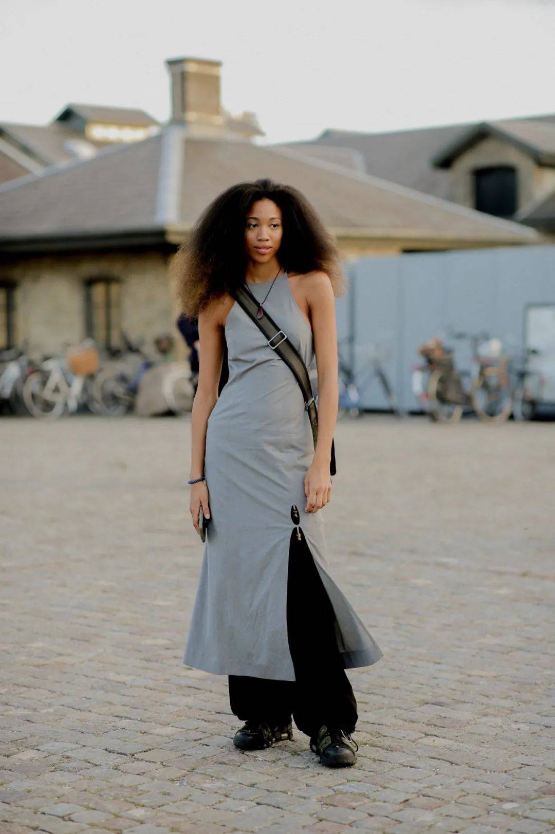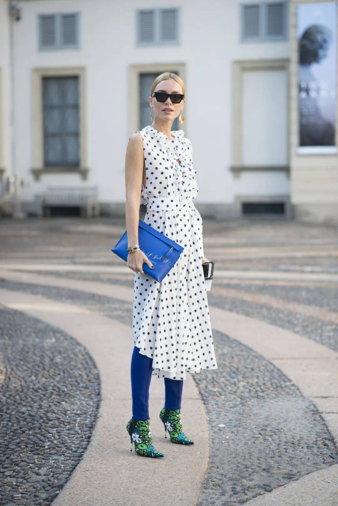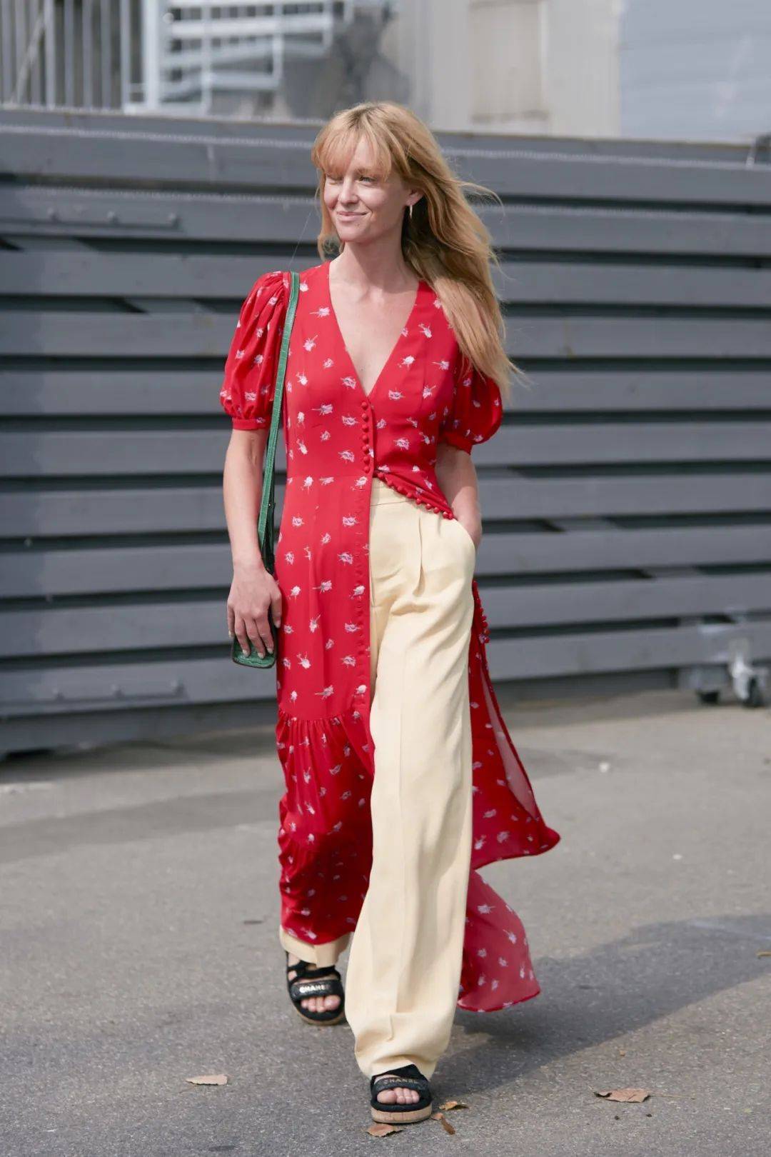 尤其是那些无袖长款连衣裙,真在38、39度的三伏天穿还是有点热的,可眼下这30度出头的气温叠穿一条裤子倒是正好。这样还能免去走光和室内外温差太大的困扰,算得上一举多得。