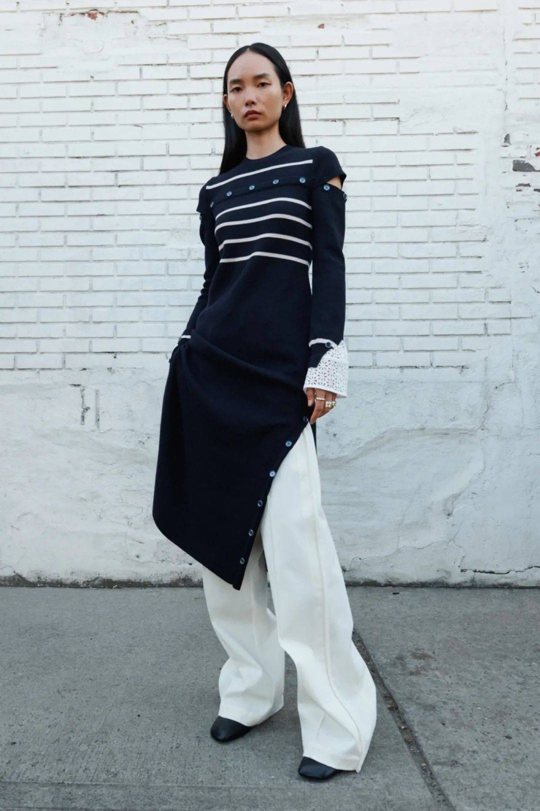 由于上半身露出面积会比下半身大,因此连衣裙+裤子的叠穿对上半身的要求更高。如果不想在穿搭上“翻车”,那么尽可能让上身保持简约、清爽,切忌分割太多层,否则会把整个人“割裂”——
