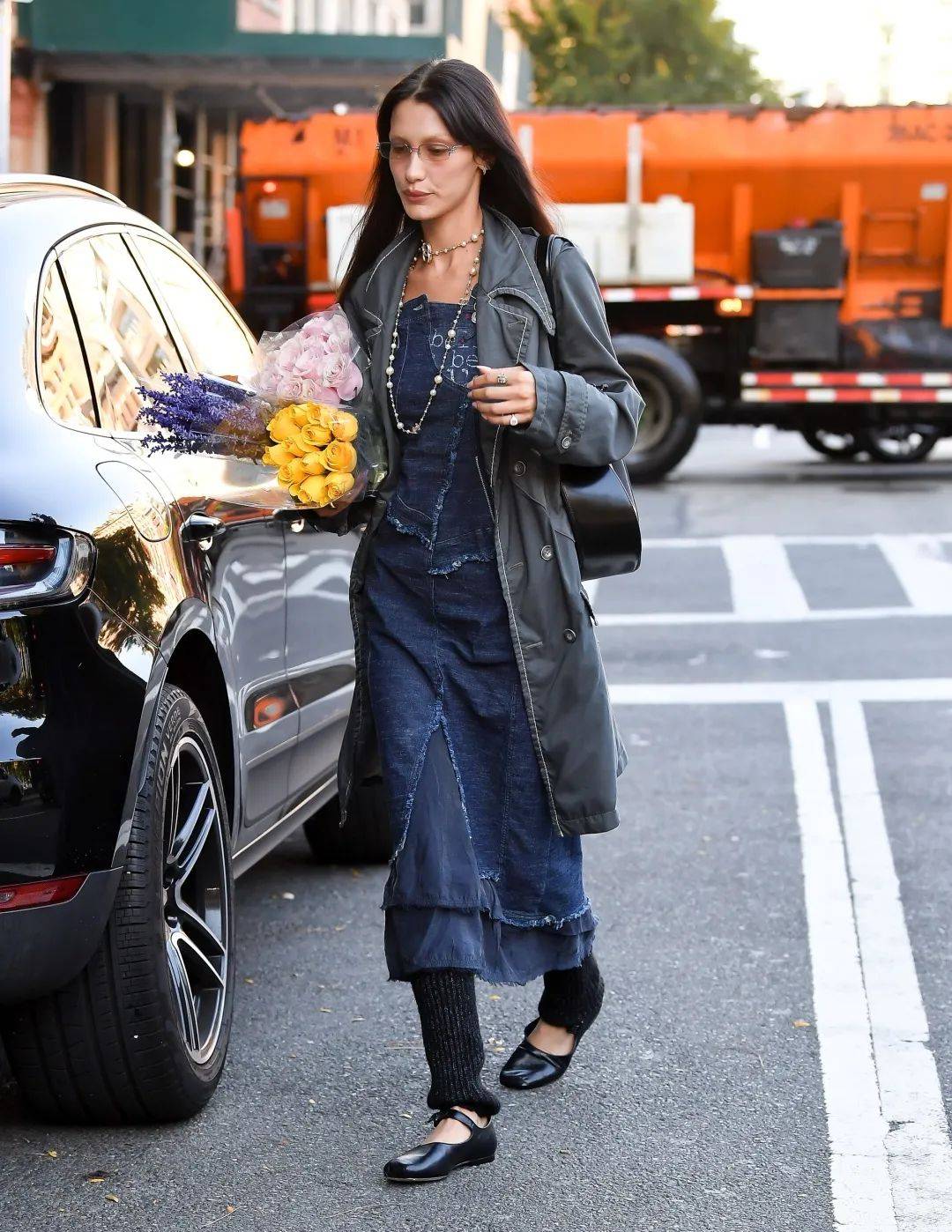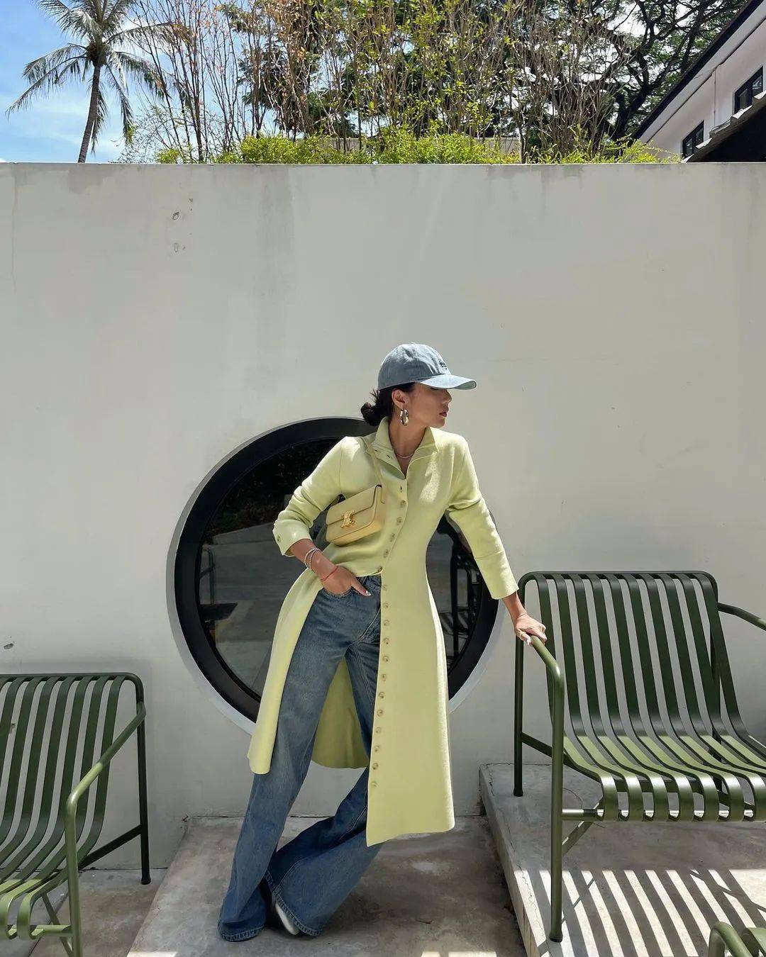 那要是天气再转凉,这组穿搭就不再实用吗?倒也未必,如果裙子的材质穿得厚了,比如针织面料,那可以试试给裙子开个衩,尽量多露出腿部,以此也能起到显腿长的效果。