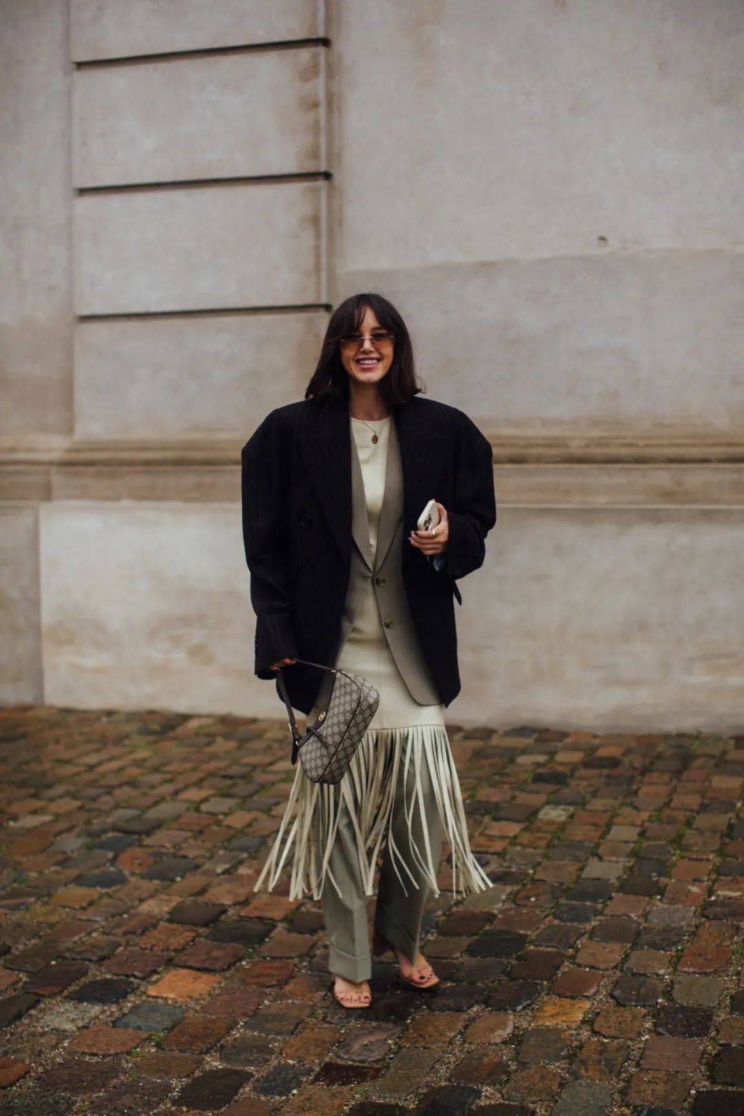 同样是西装+连衣裙+裤子,运用基本款叠穿,再减少装饰元素之后,展现出来的效果不是就比上面的要顺眼很多吗?