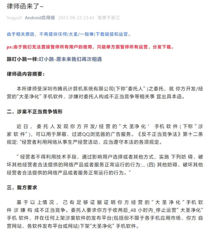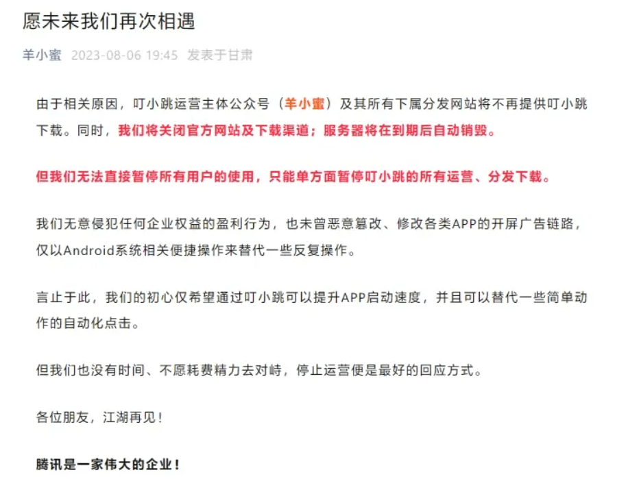 近日凌晨,“李跳跳” 作者在公众号宣布无限期停止更新,原因是收到了某集团律师函,对方称 “李跳跳” APP 涉嫌不正当竞争,对旗下的浏览器产生影响,并要求四十八小时内全网下架 “李跳跳”。